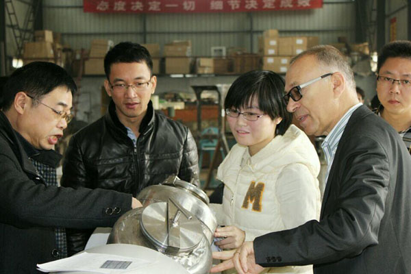 天創(chuàng)技術(shù)人員為Bruno先生介紹V型混合機(jī)。