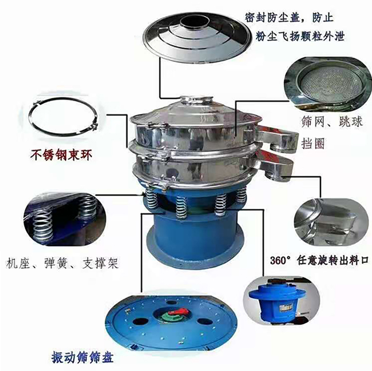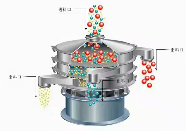 三次元旋振篩由直立式電機(jī)作激振源,電機(jī)上、下、兩端安裝有偏心重錘,將電機(jī)的旋轉(zhuǎn)運(yùn)動(dòng)轉(zhuǎn)變?yōu)樗健⒋怪薄A斜的三次元運(yùn)動(dòng),再把這個(gè)運(yùn)動(dòng)傳遞給篩面。調(diào)節(jié)上、下兩端的相位角,可以改變物料在篩面上的運(yùn)動(dòng)軌跡。