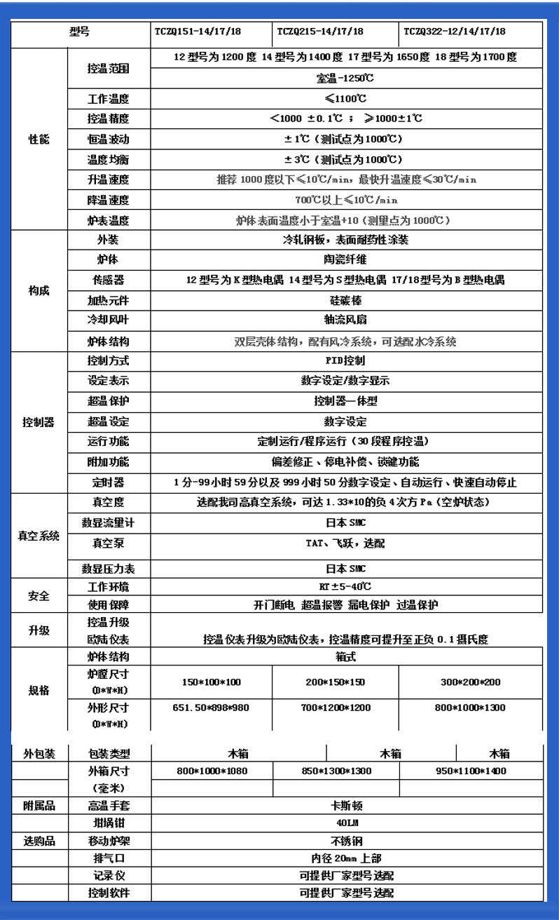 ▪ 加熱元件1200攝氏度,1400攝氏度,1700攝氏度,采用優質高電阻優質合金絲OCr27FAI7Mo2,優質硅碳棒,優質硅鉬棒,最高發熱溫度可達1200攝氏度,1400攝氏度,1700攝氏度。